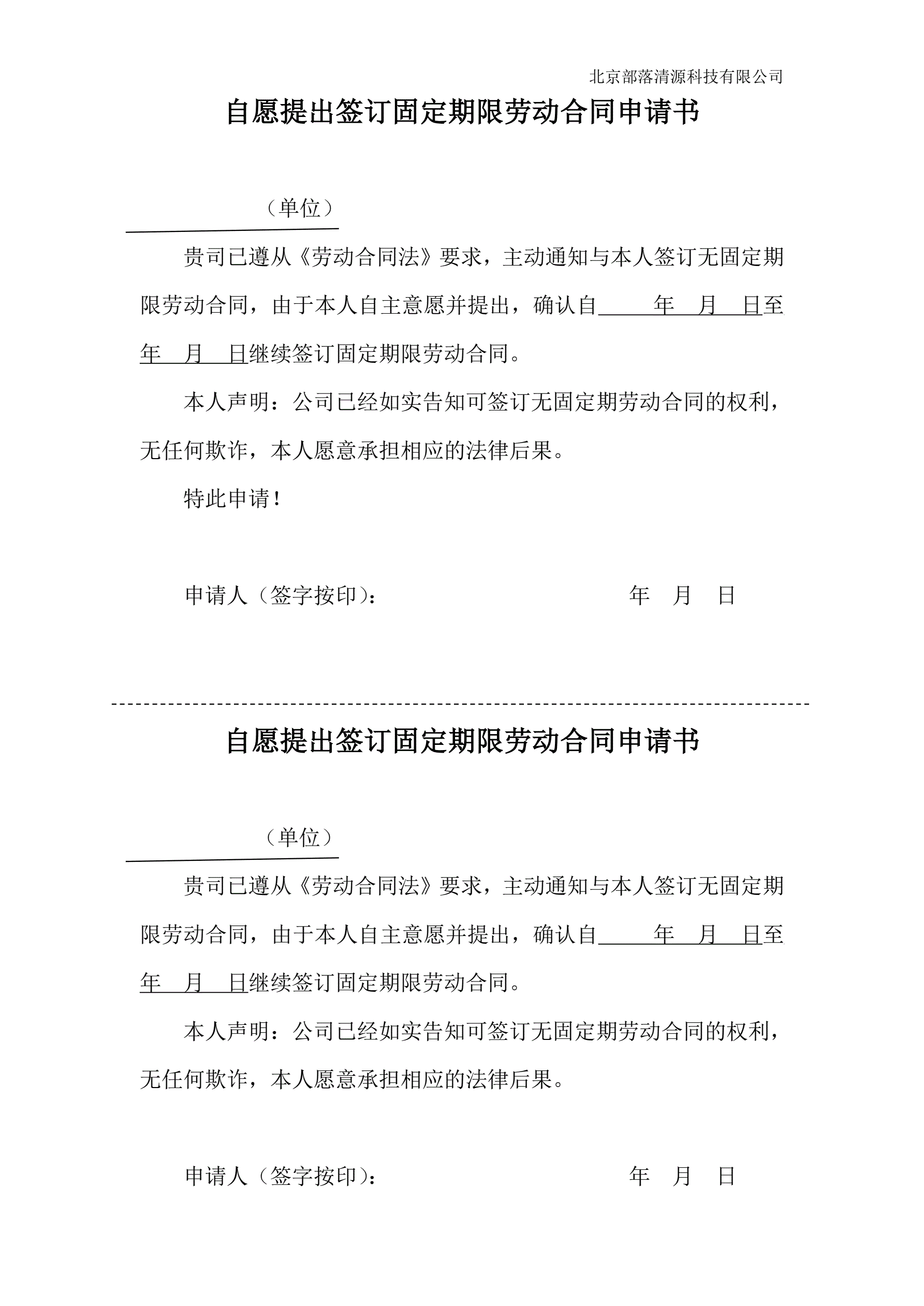员工自愿申请签订固定期限劳动合同申请书