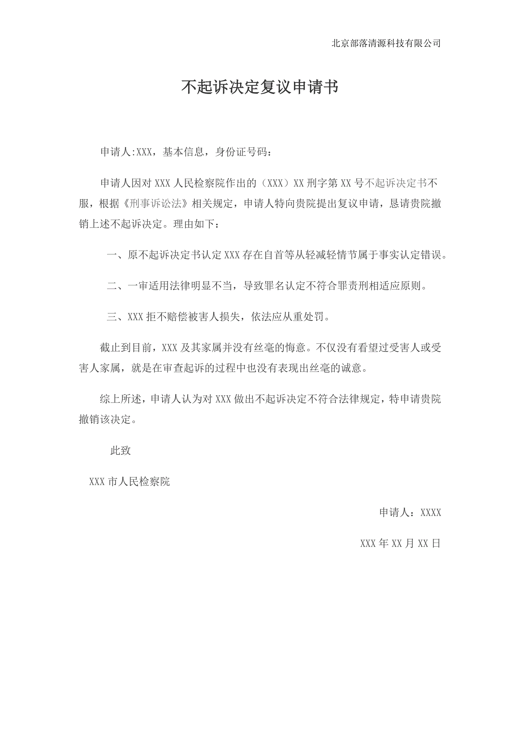 >不起诉决定复议申请书