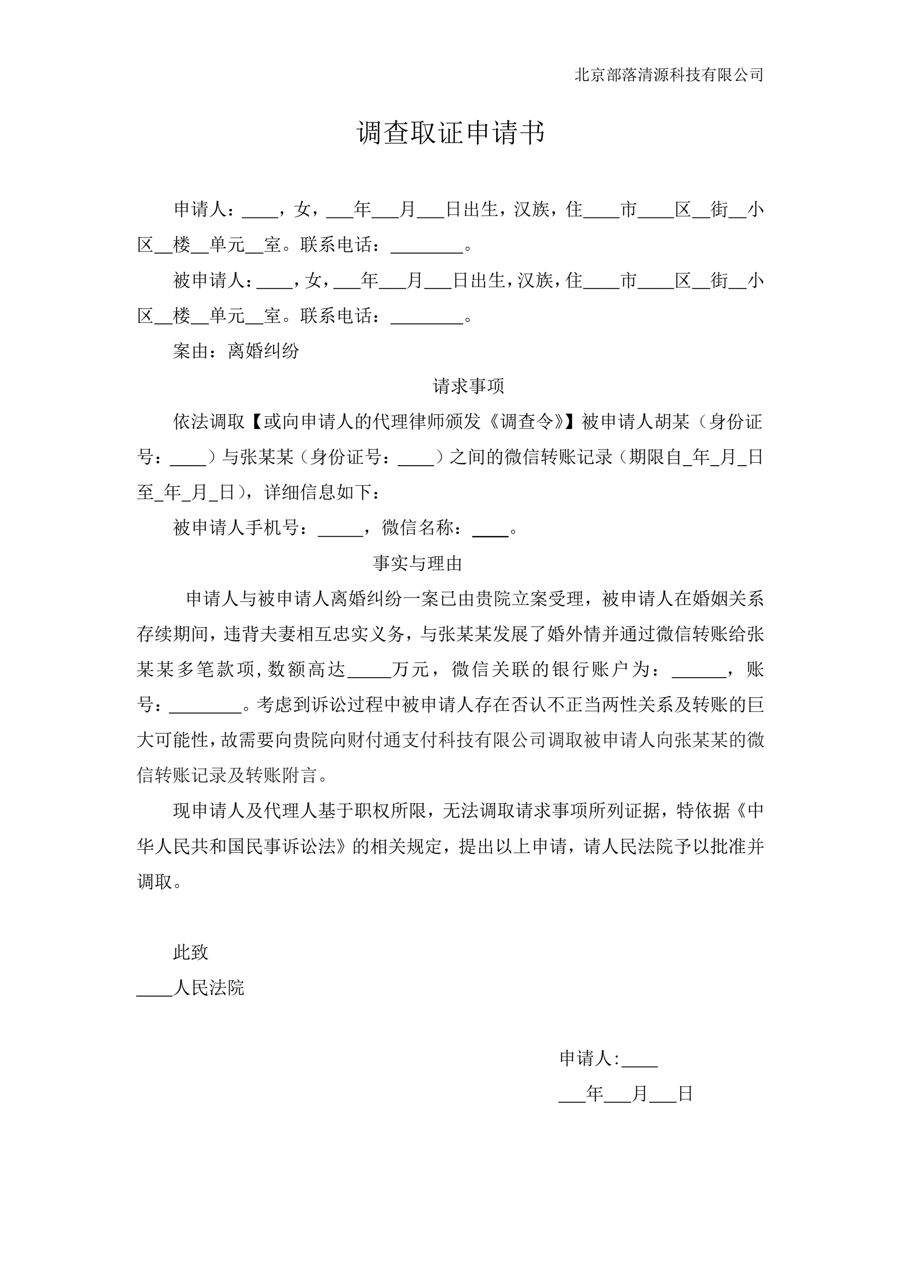 >调查取证申请书(微信转账记录)