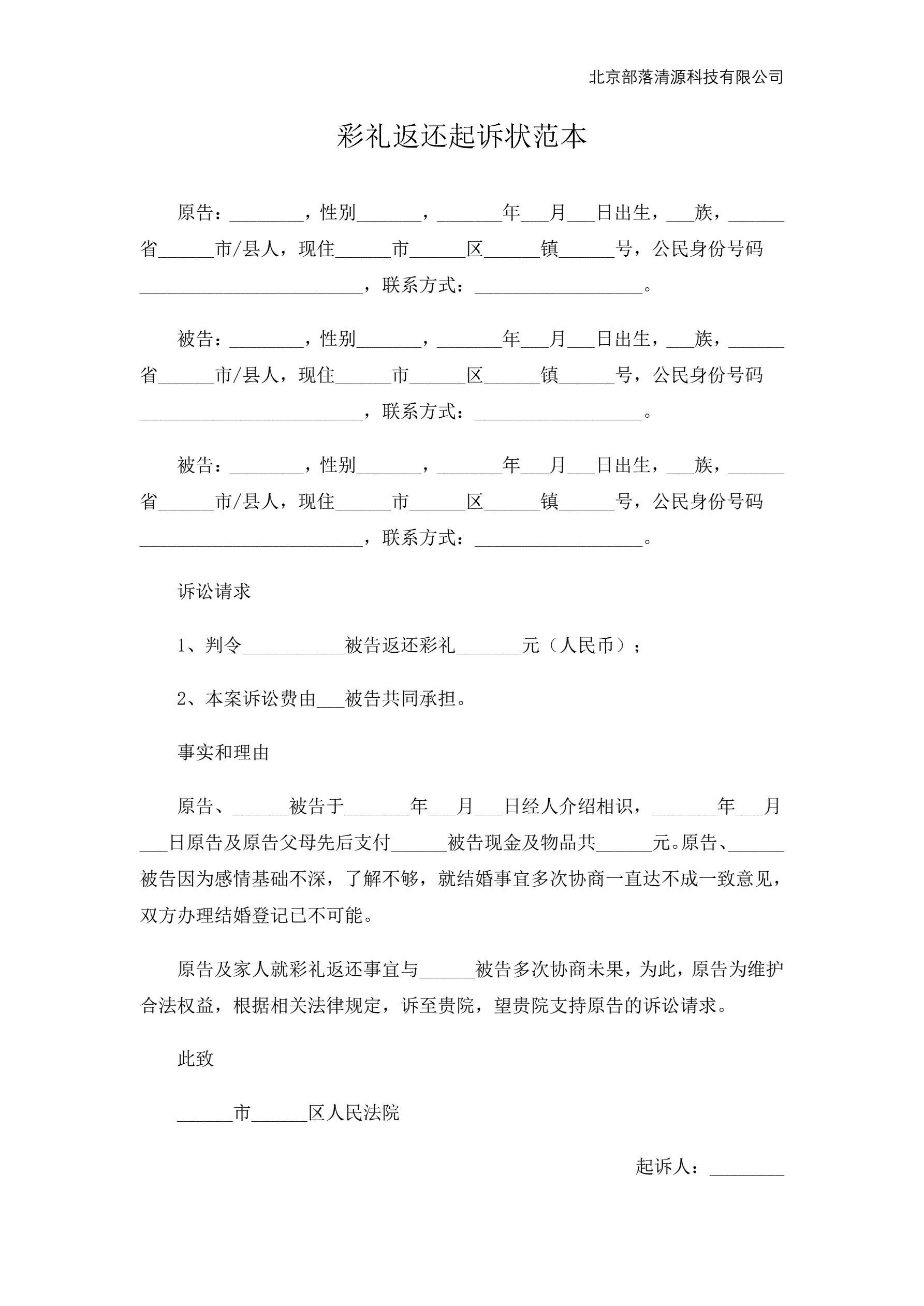 彩礼返还起诉状范本
