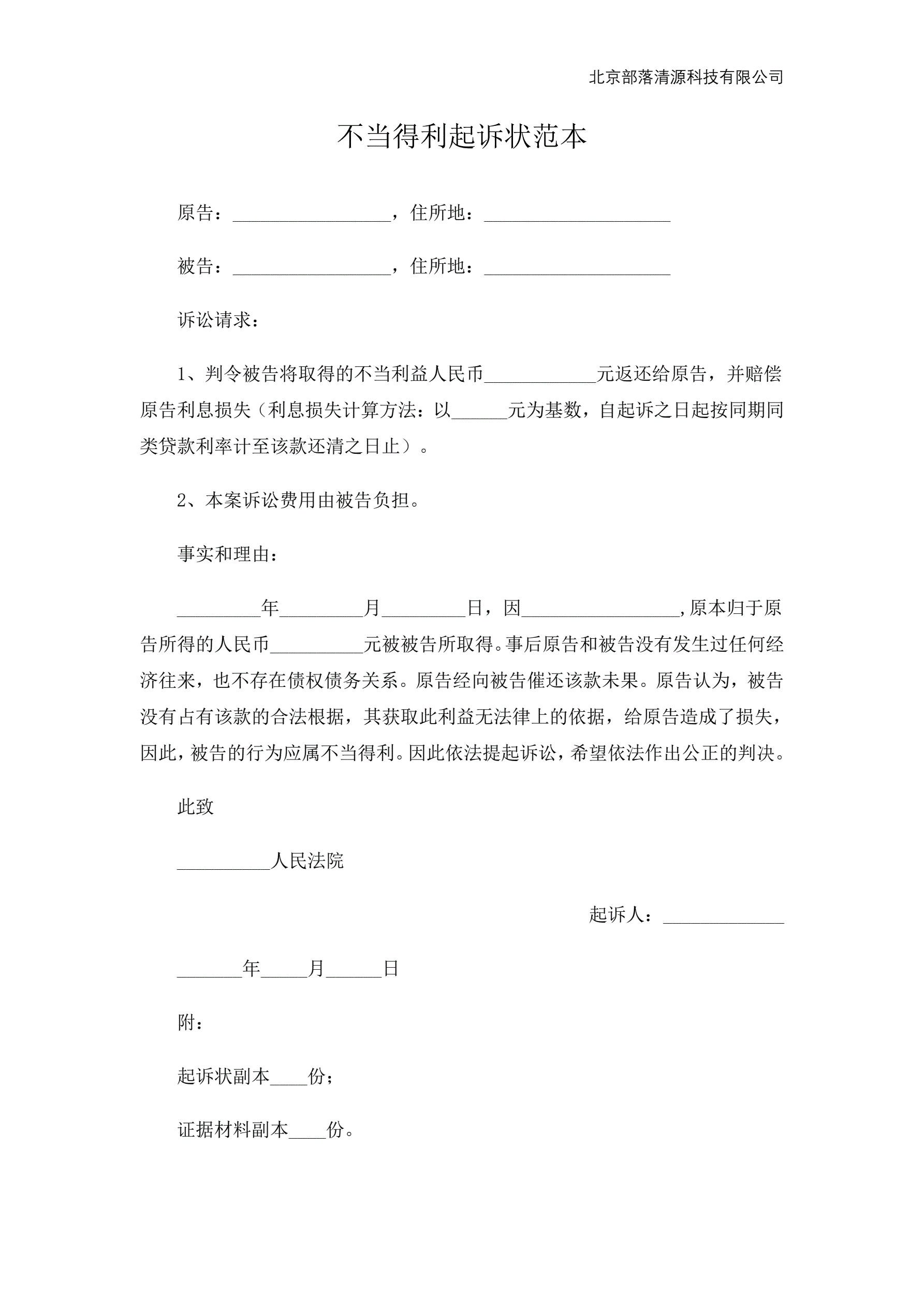 >不当得利起诉状范本