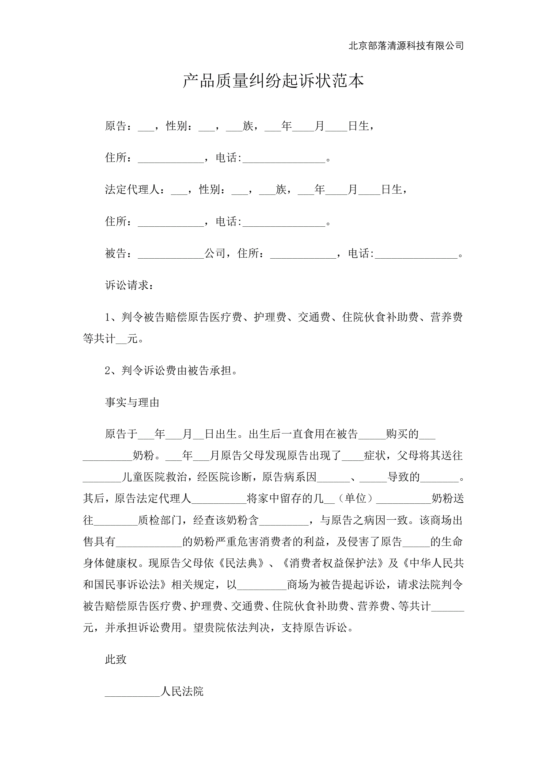 产品质量纠纷起诉状范本