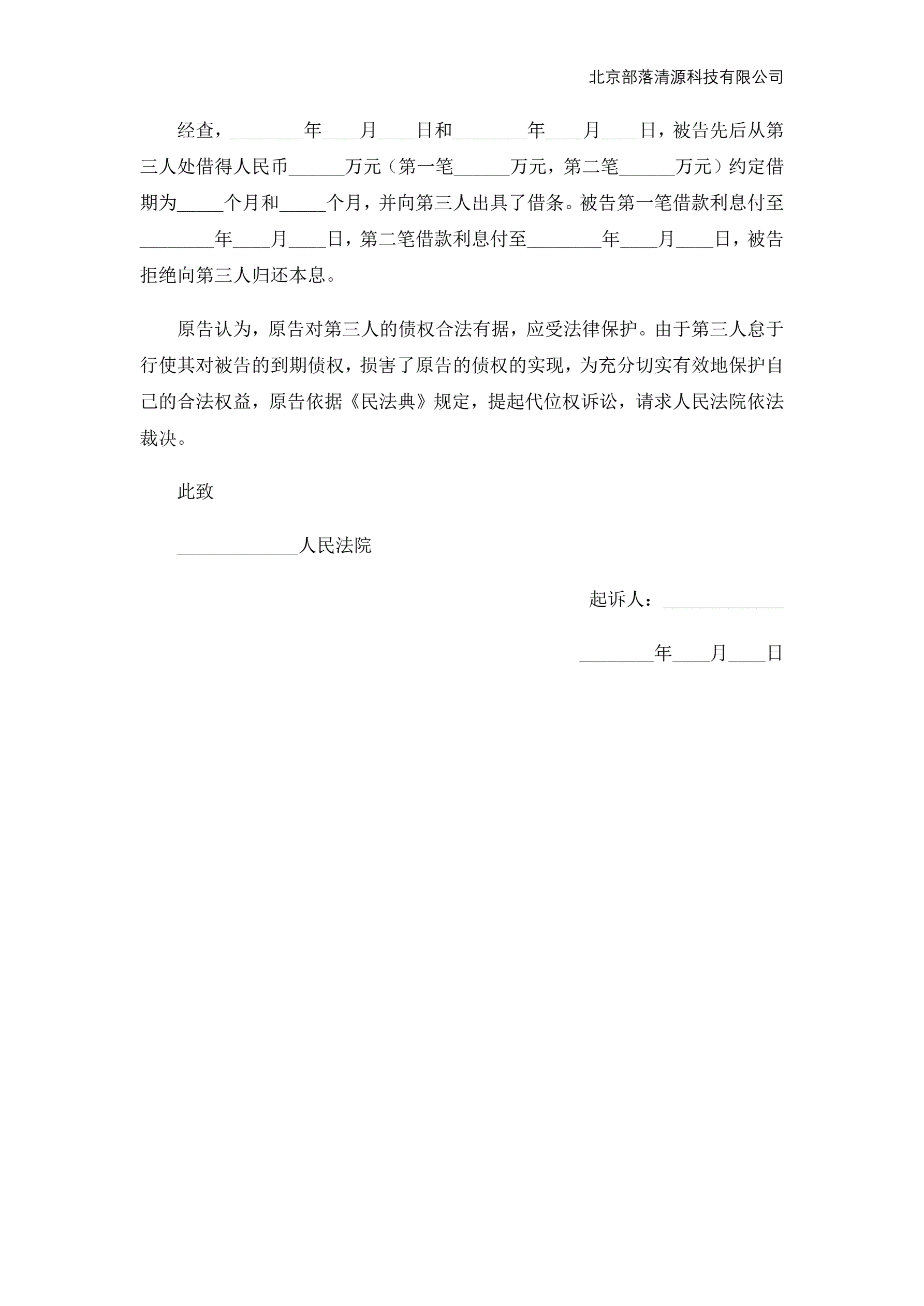 代位权诉讼起诉状范本