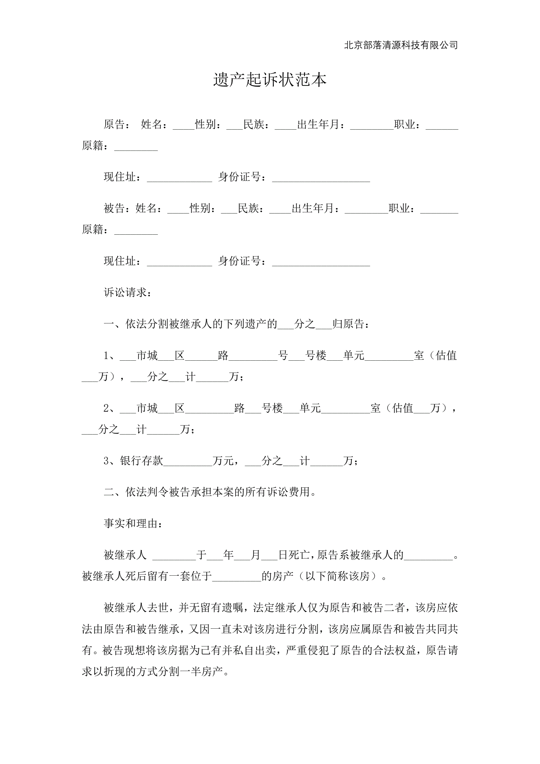 遗产起诉状范本