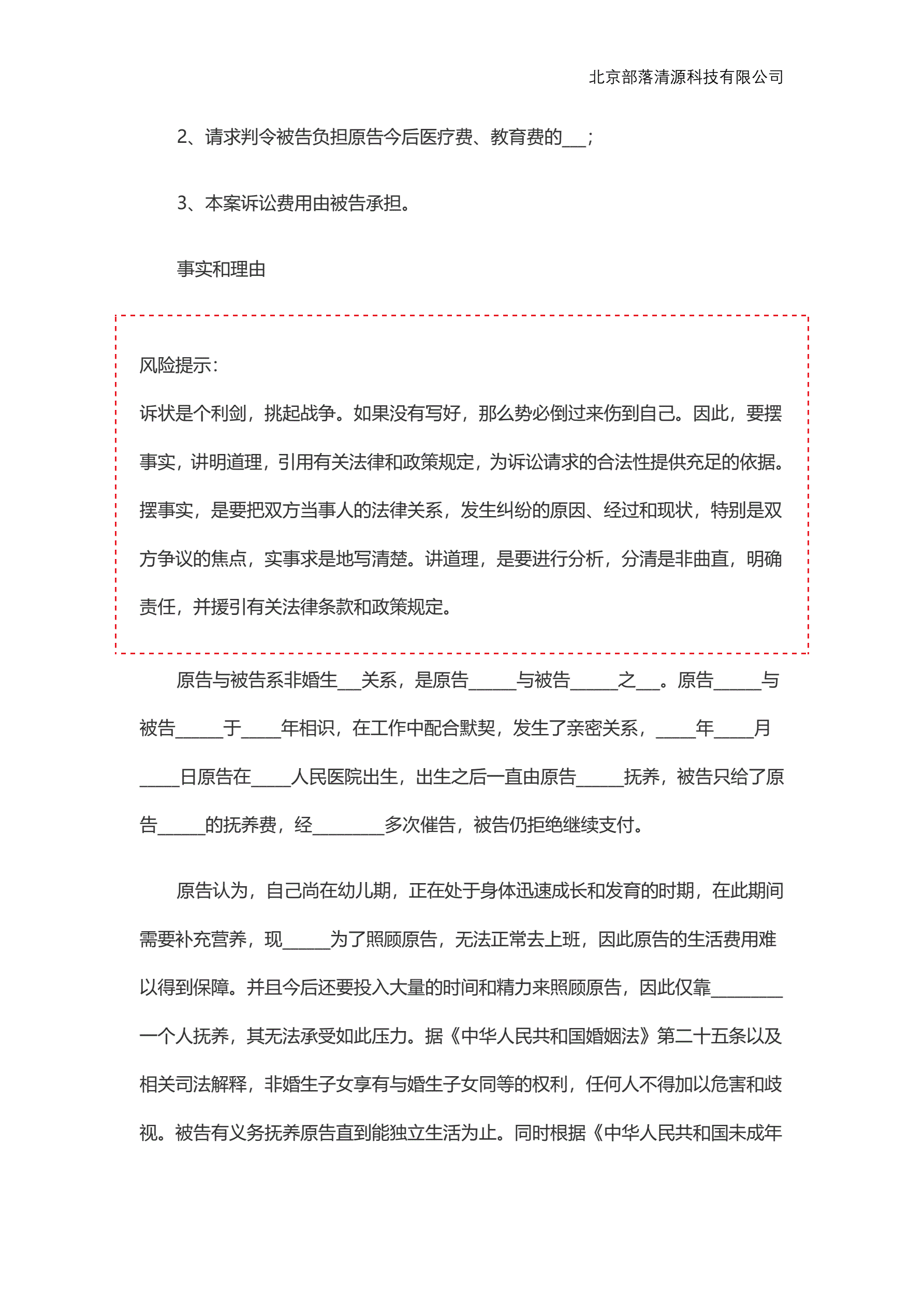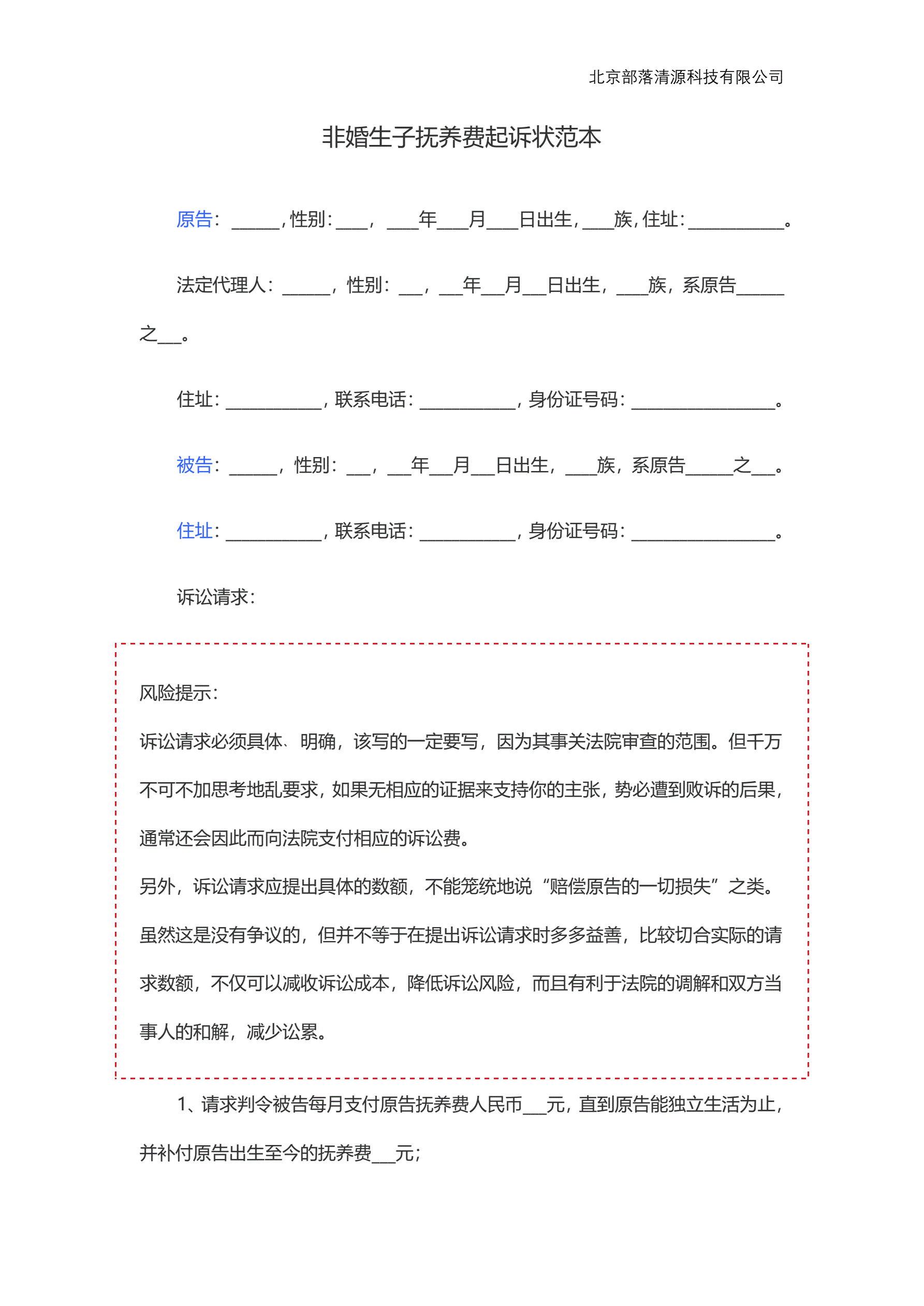 >非婚生子抚养费起诉状范本