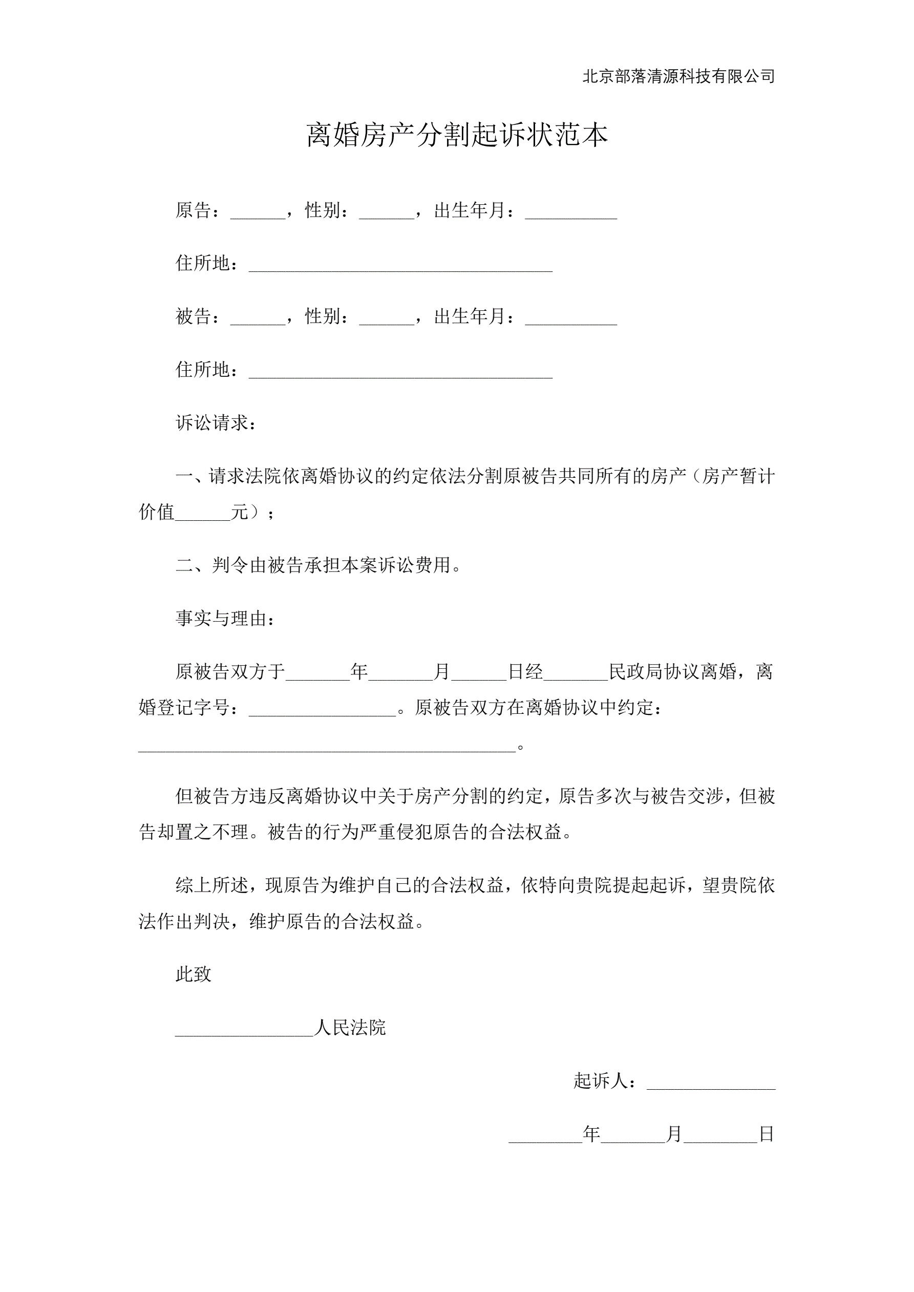 >离婚房产分割起诉状范本