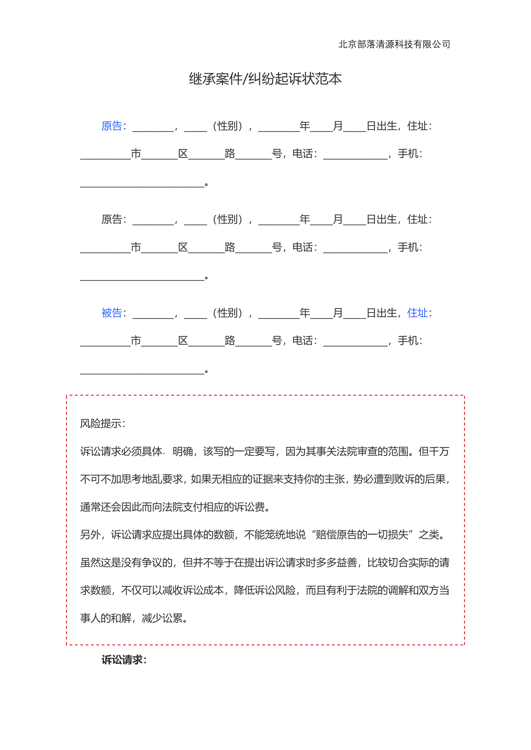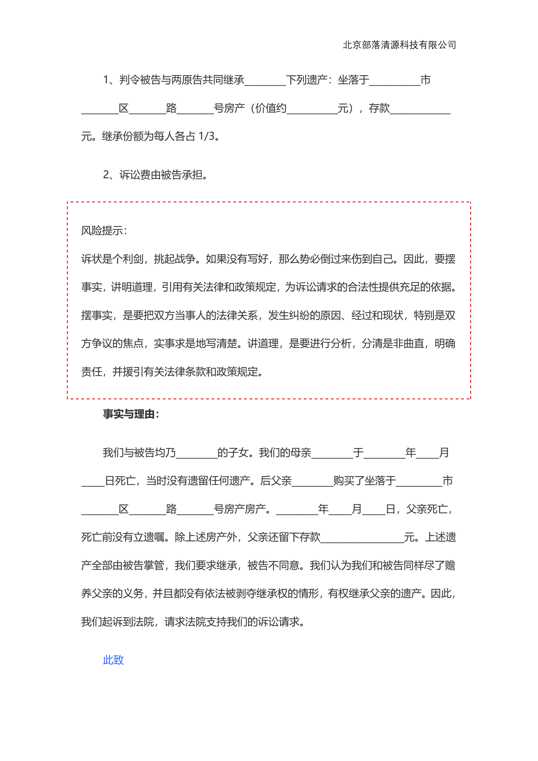 >继承案件 纠纷起诉状范本