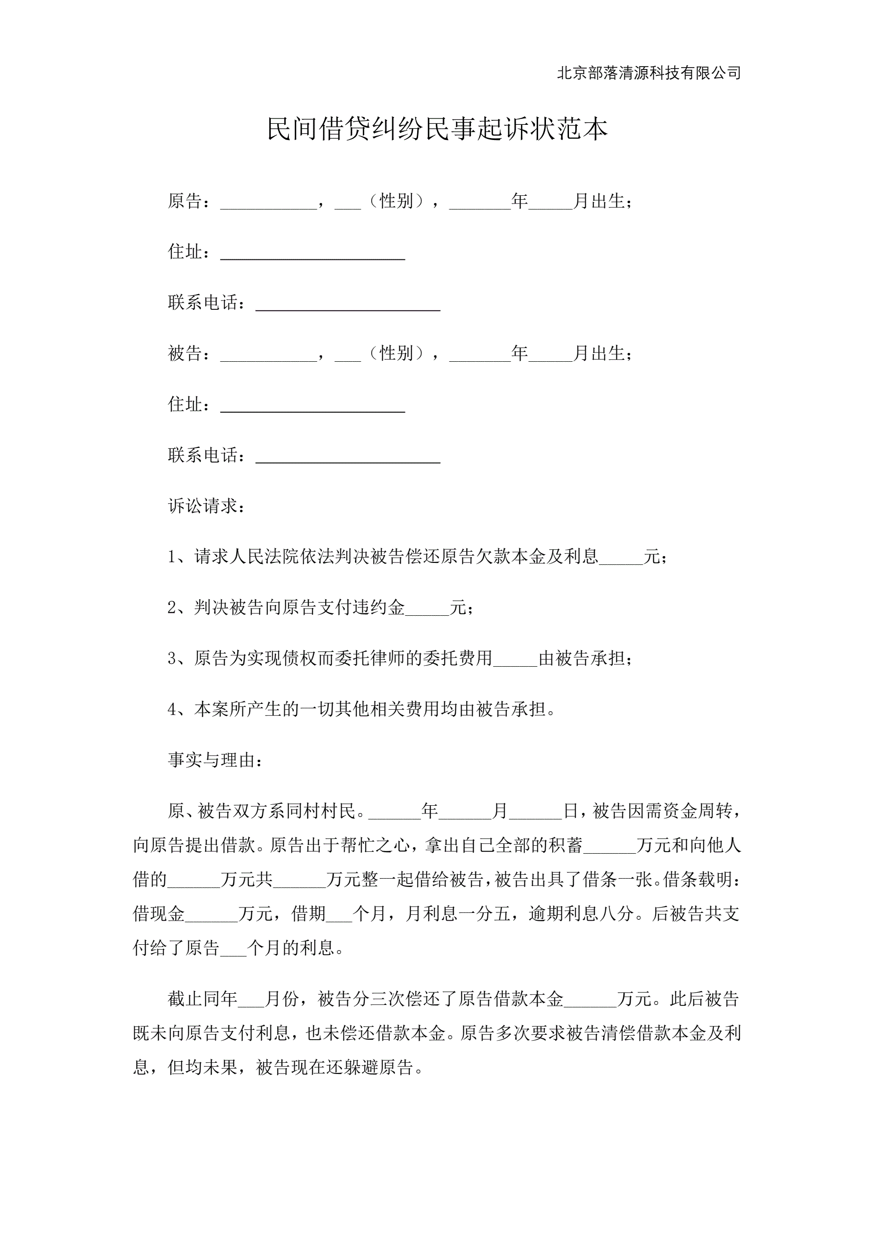 民间借贷纠纷民事起诉状范本
