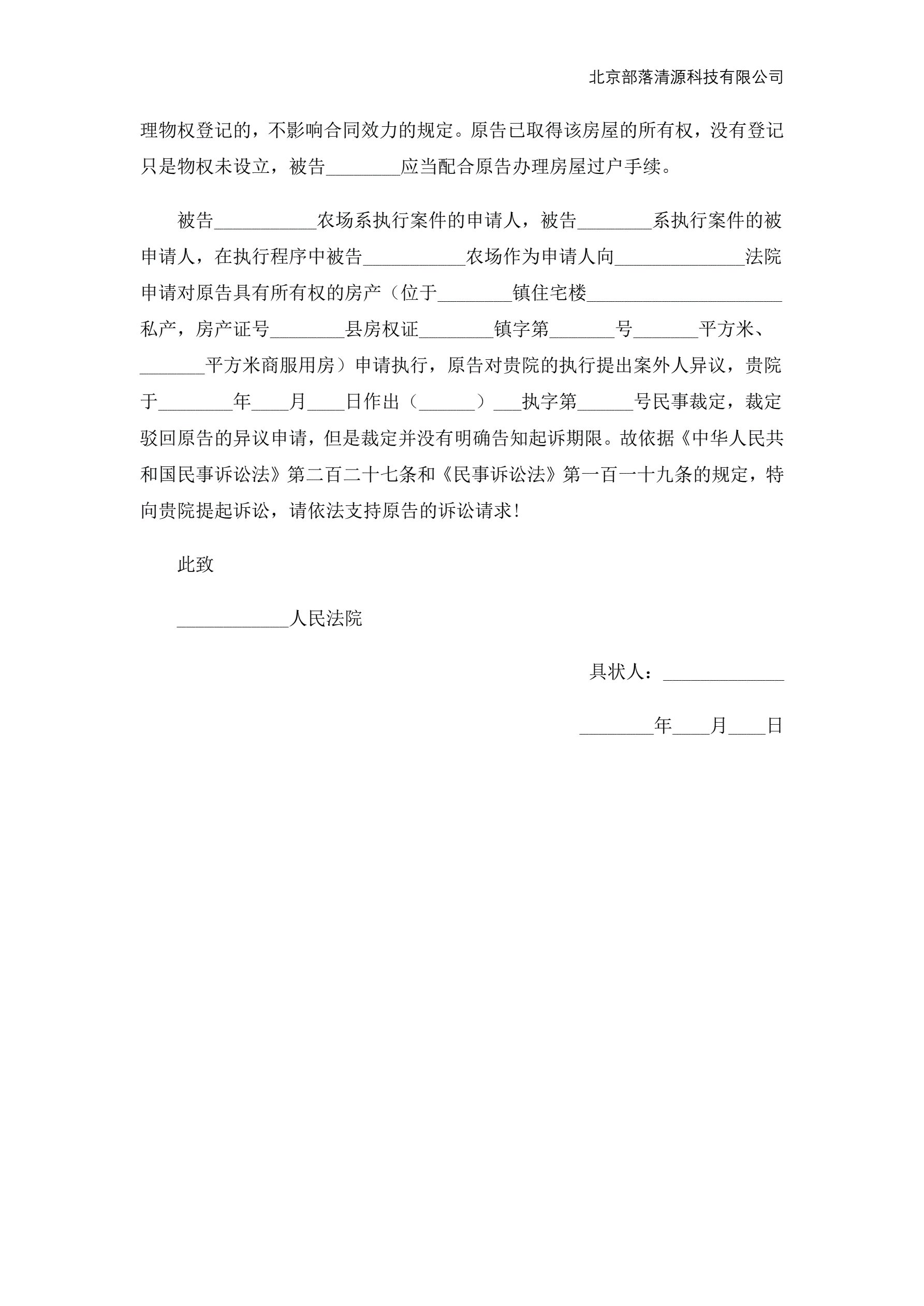 执行异议起诉状范本