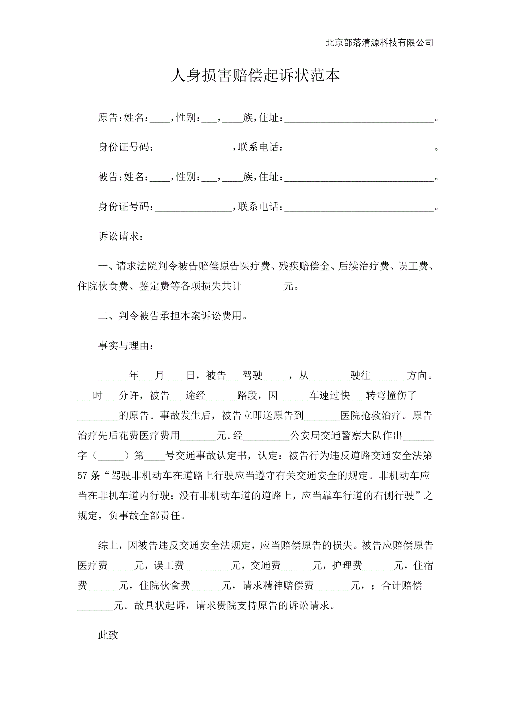 人身损害赔偿起诉状范本