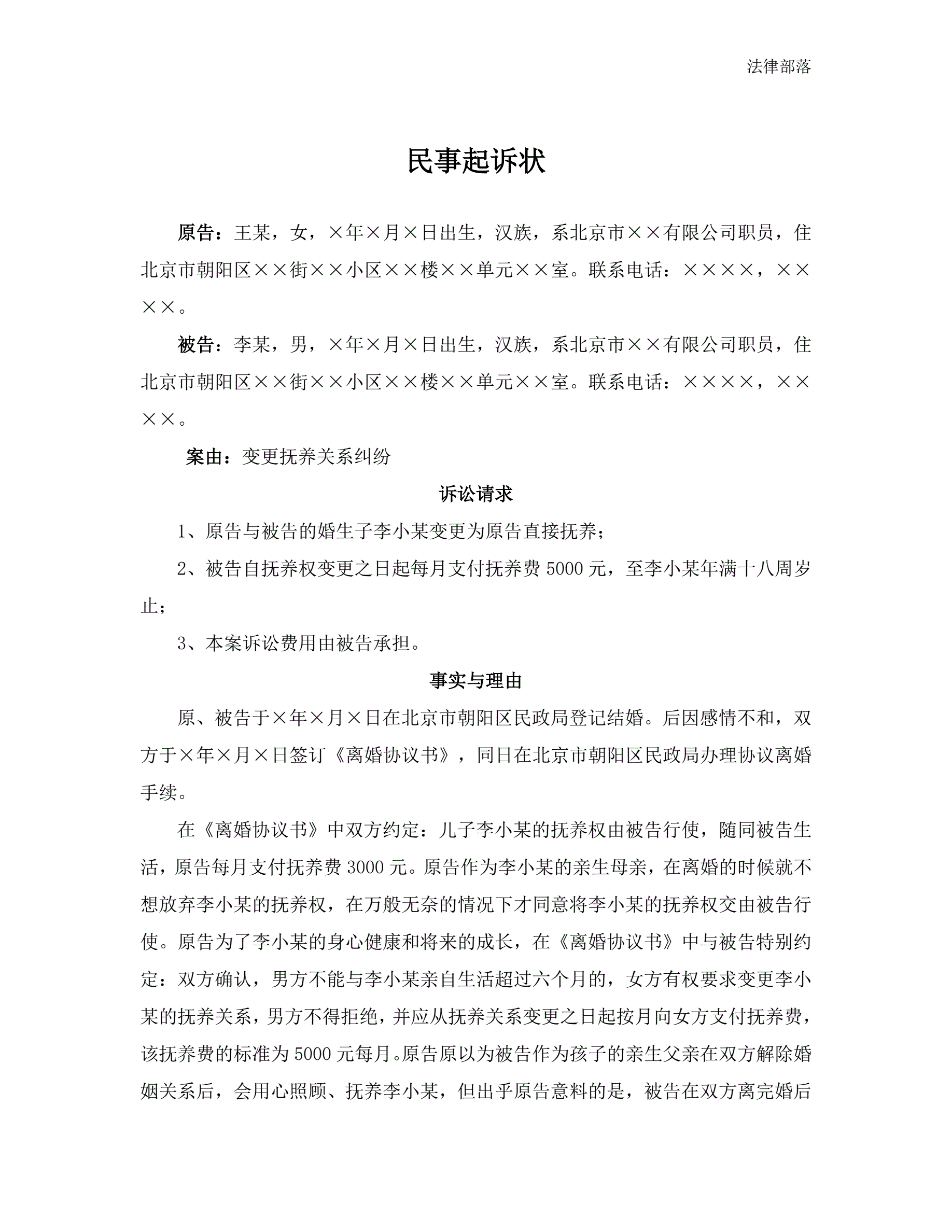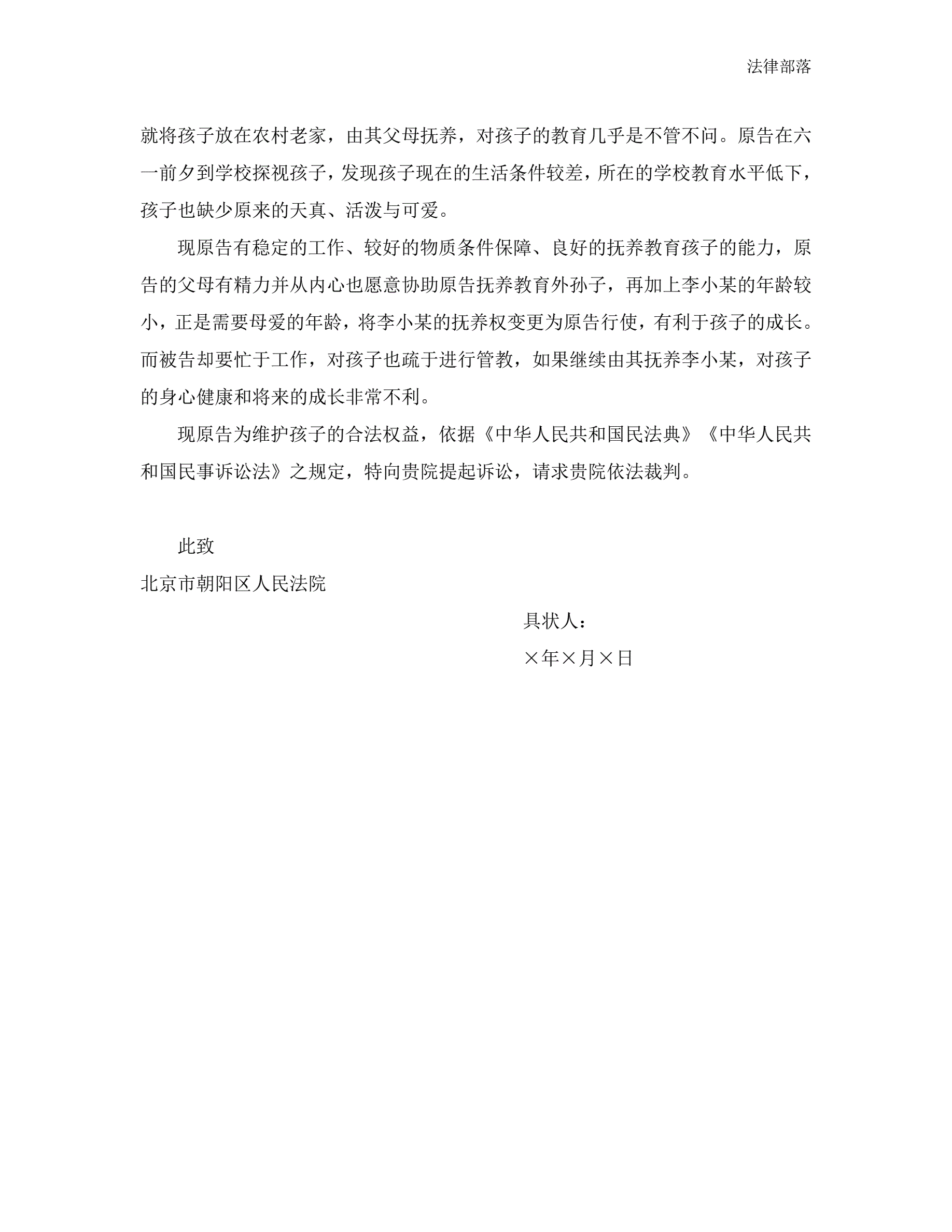 合同名称:民事起诉状(变更抚养关系纠纷)