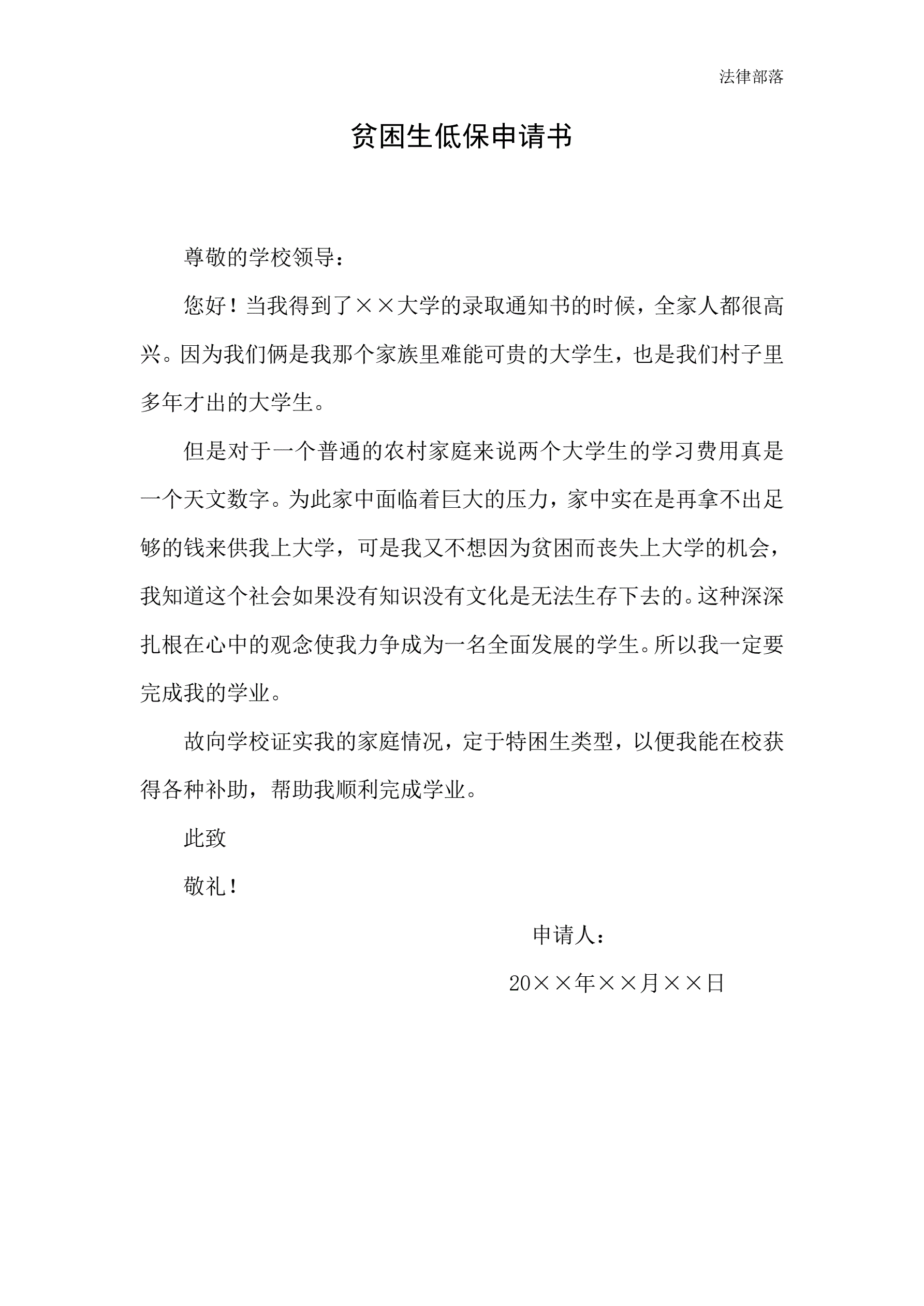 特困生低保申请书范文