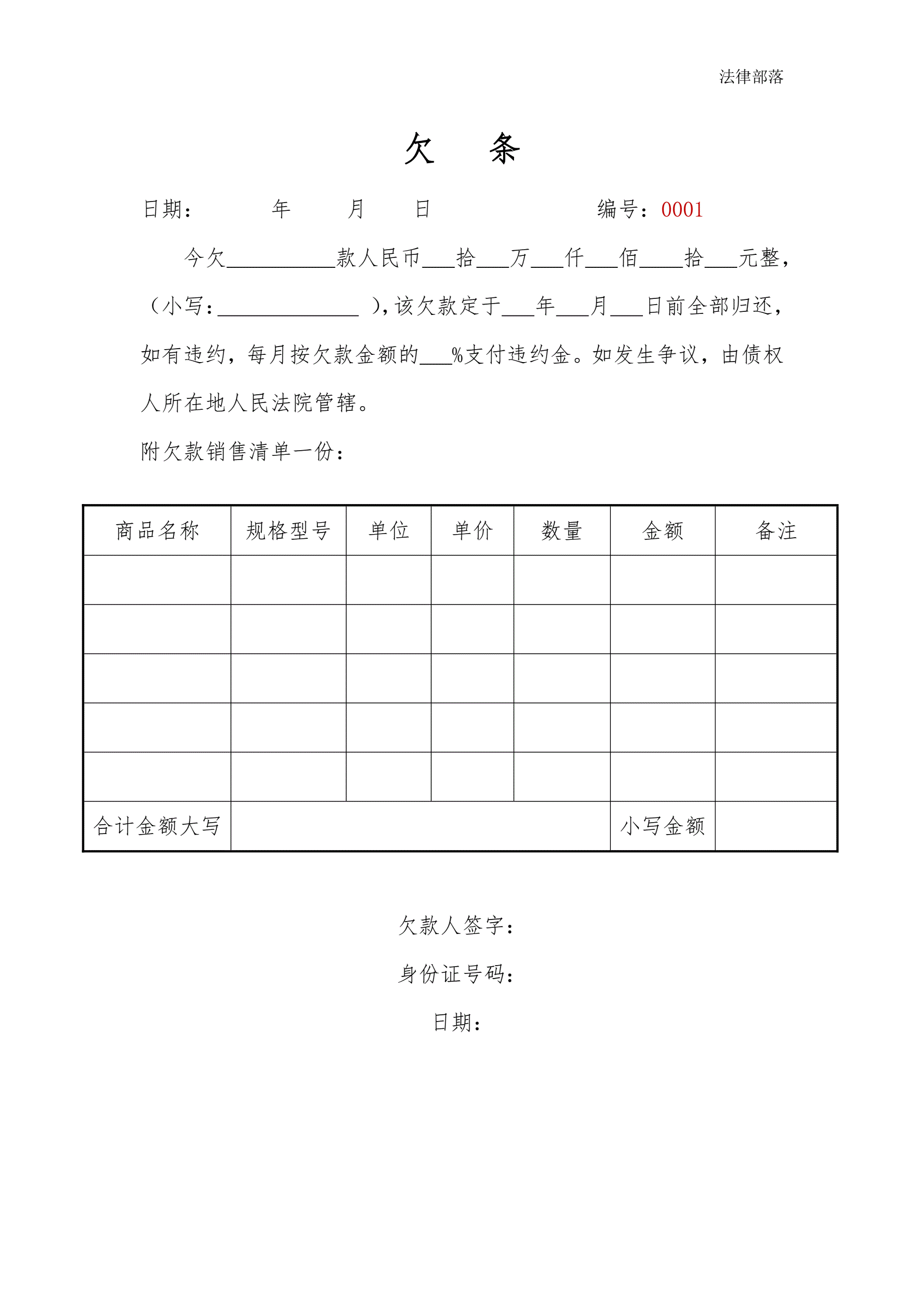 商品款欠条