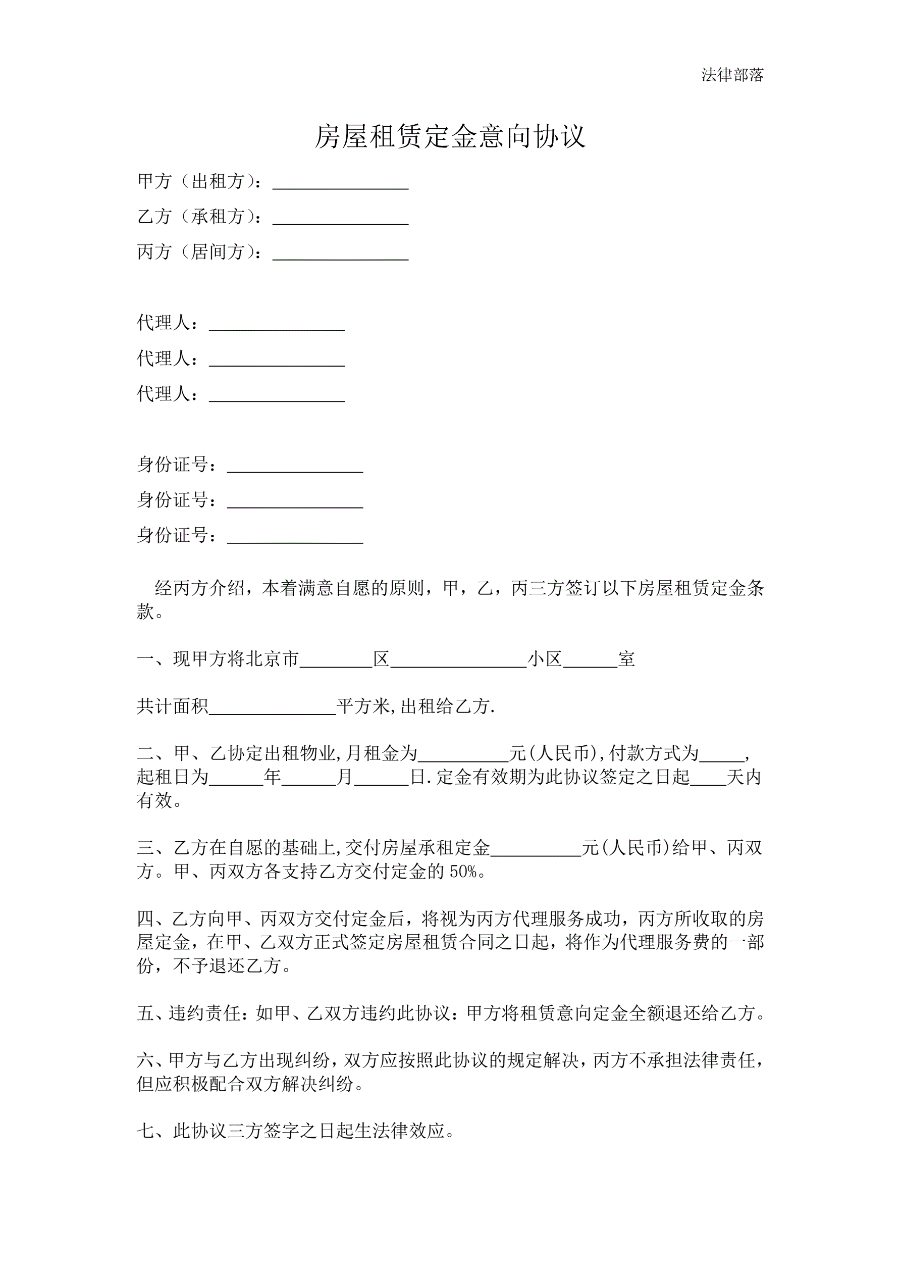 房屋租赁定金意向协议