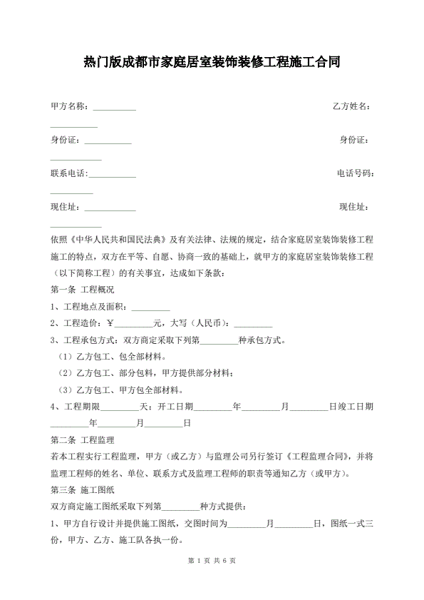 热门版成都市家庭居室装饰装修工程施工合同