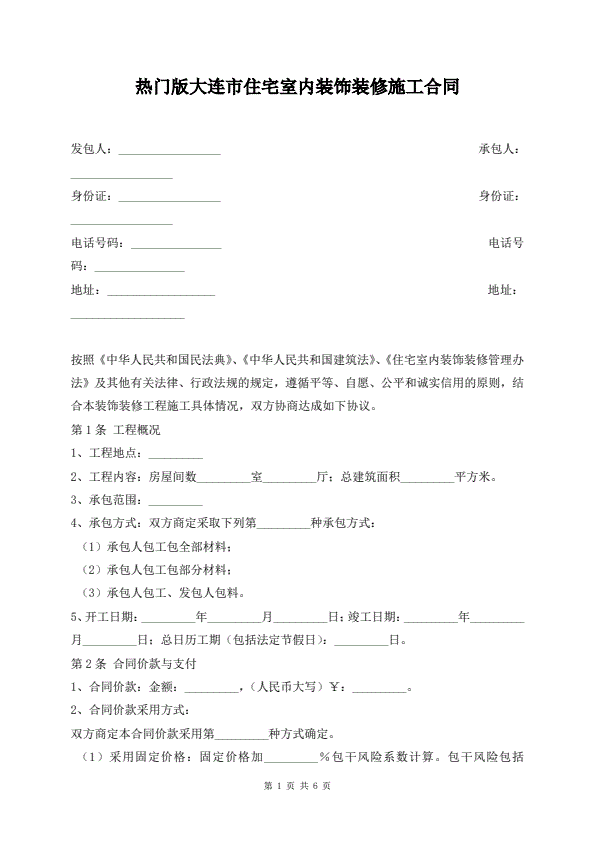 热门版大连市住宅室内装饰装修施工合同