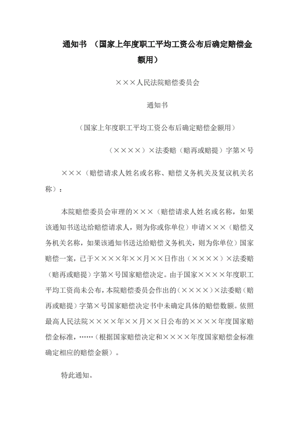 通知书(国家上年度职工平均工资公布后确定赔偿金额用)