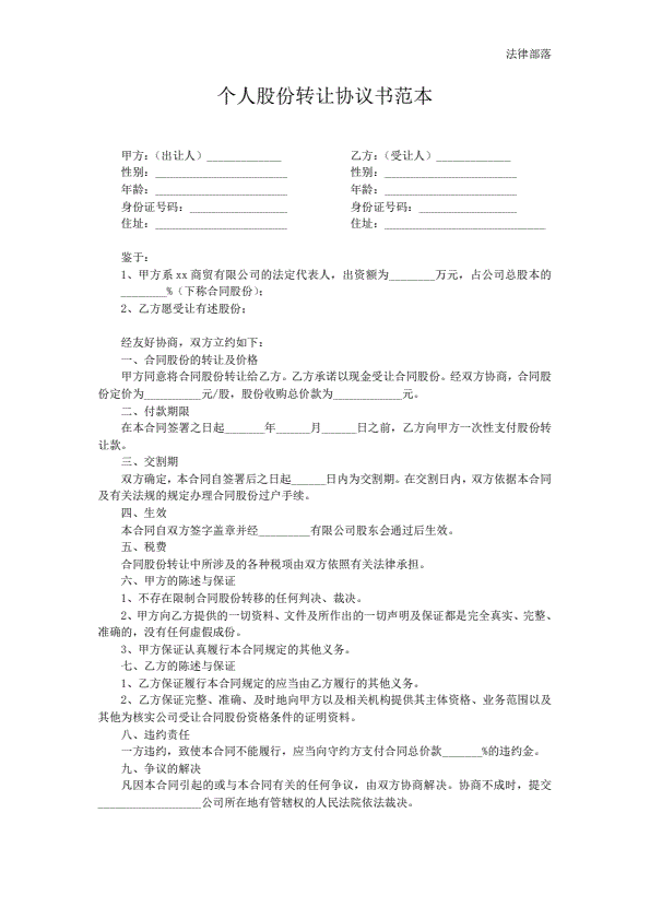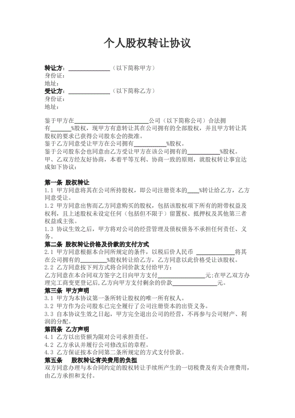 个人股份转让协议书