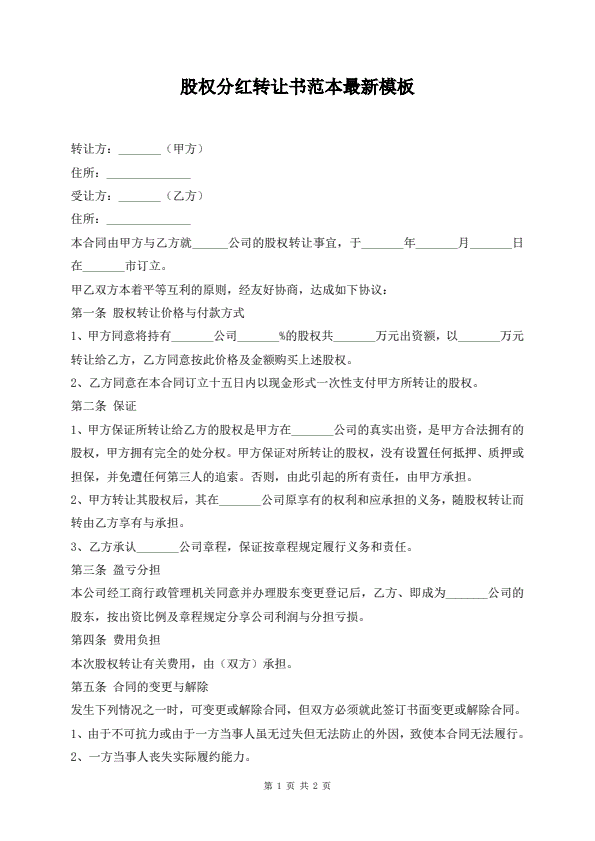 股权分红转让书范本最新模板