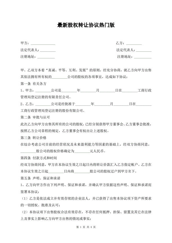 最新股权转让协议热门版