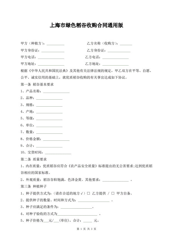 上海市绿色稻谷收购合同通用版