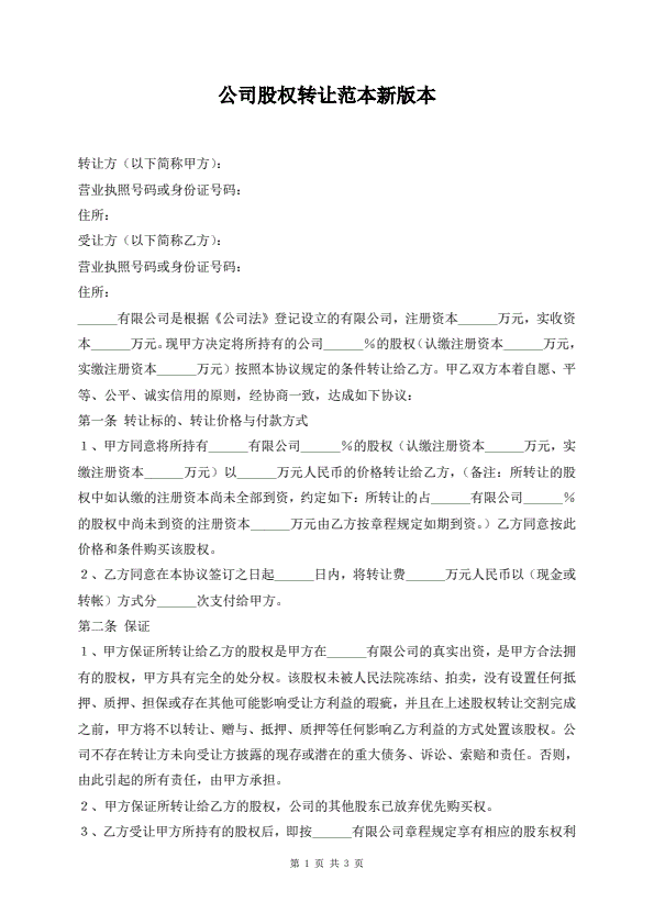 公司股权转让范本新版本