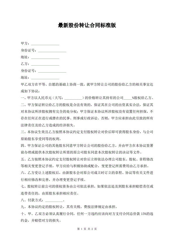 最新股份转让合同标准版