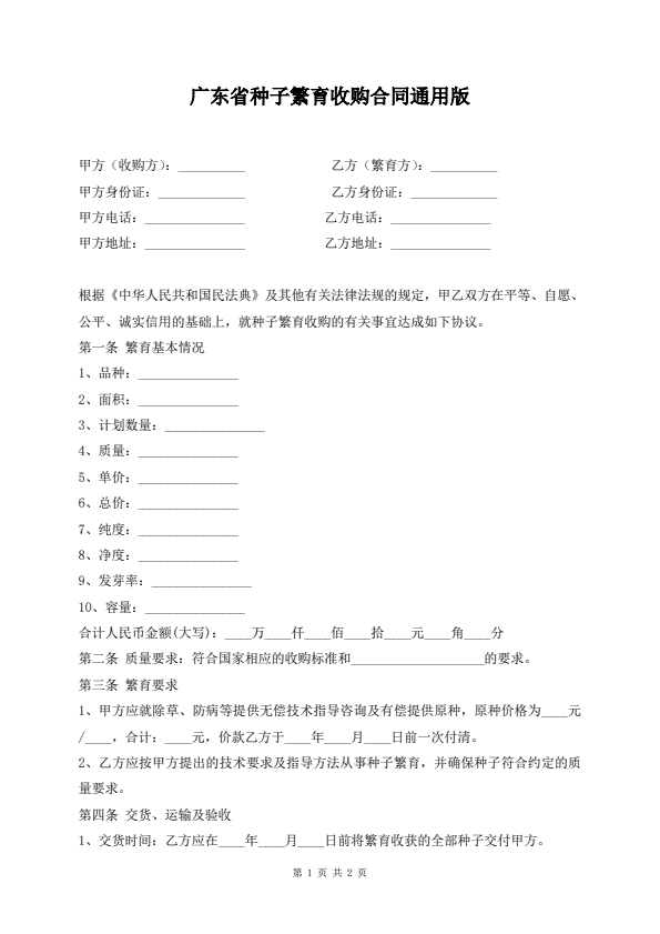 广东省种子繁育收购合同通用版