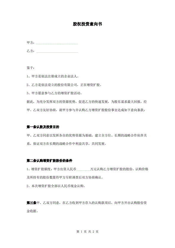 股权投资意向书(简单版)(指导版)