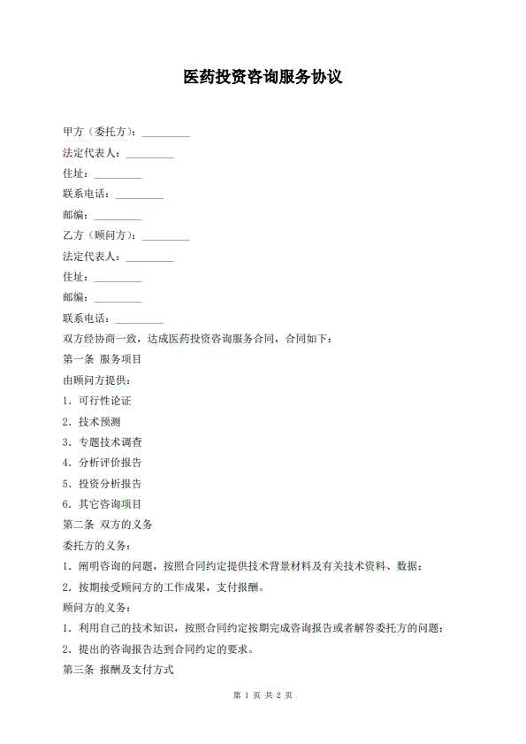 医药投资咨询服务协议