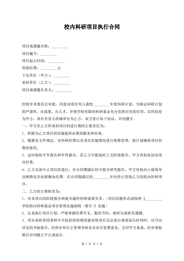 校内科研项目执行合同