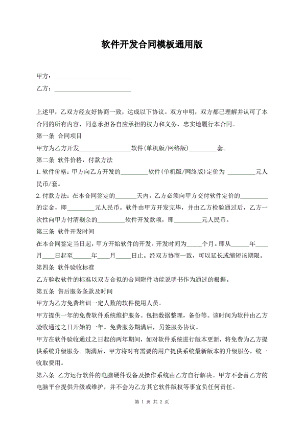 软件开发合同模板通用版