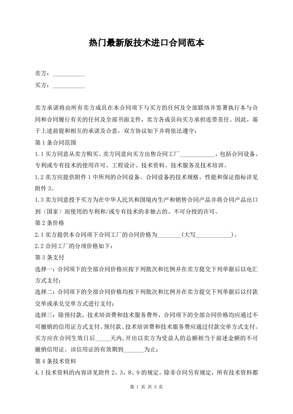 热门最新版技术进口合同范本