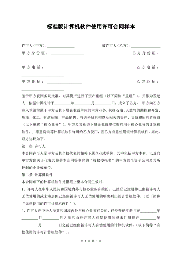 标准版计算机软件使用许可合同样本