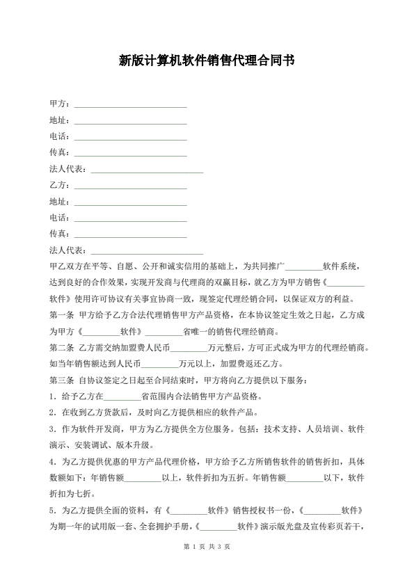 新版计算机软件销售代理合同书
