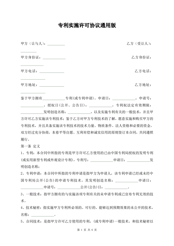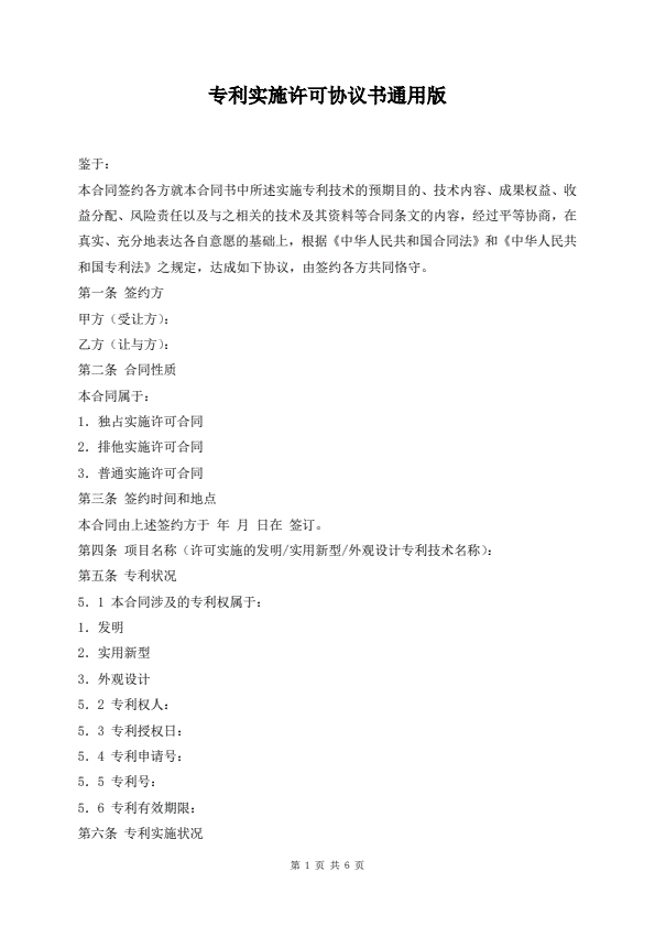 专利实施许可协议通用版