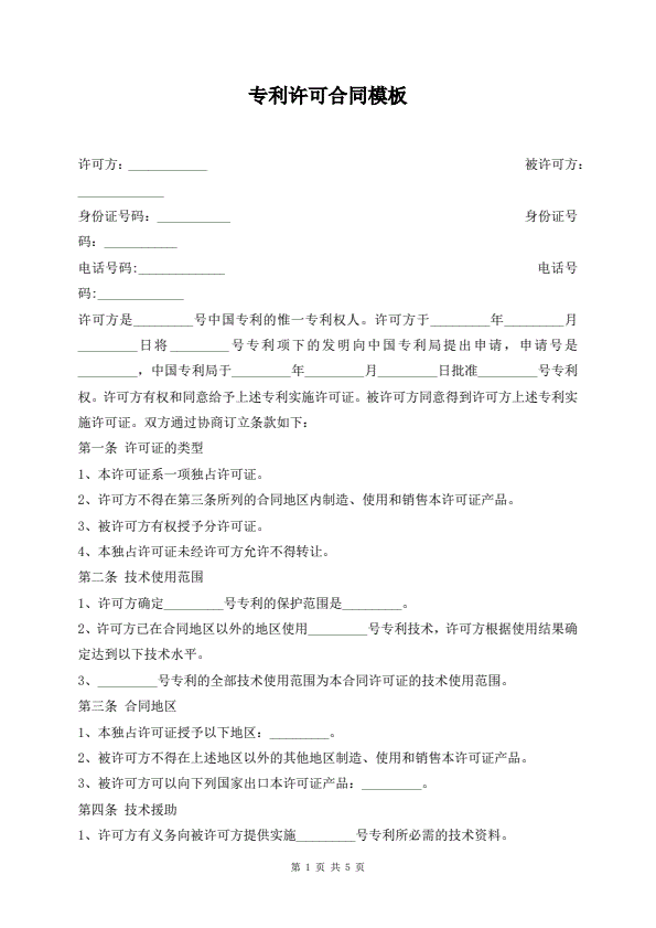 专利许可合同模板