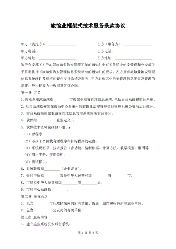 旅馆业框架式技术服务条款协议