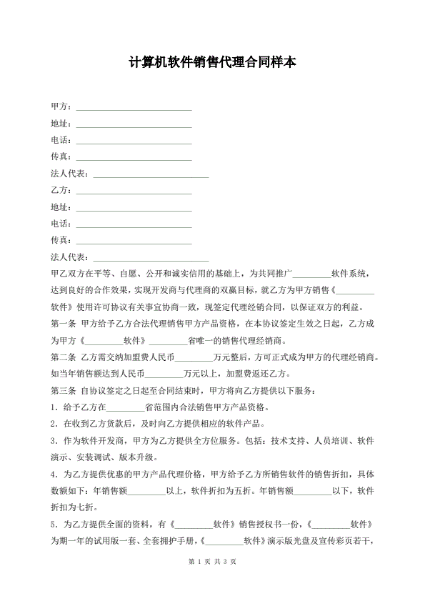 计算机软件销售代理合同样本