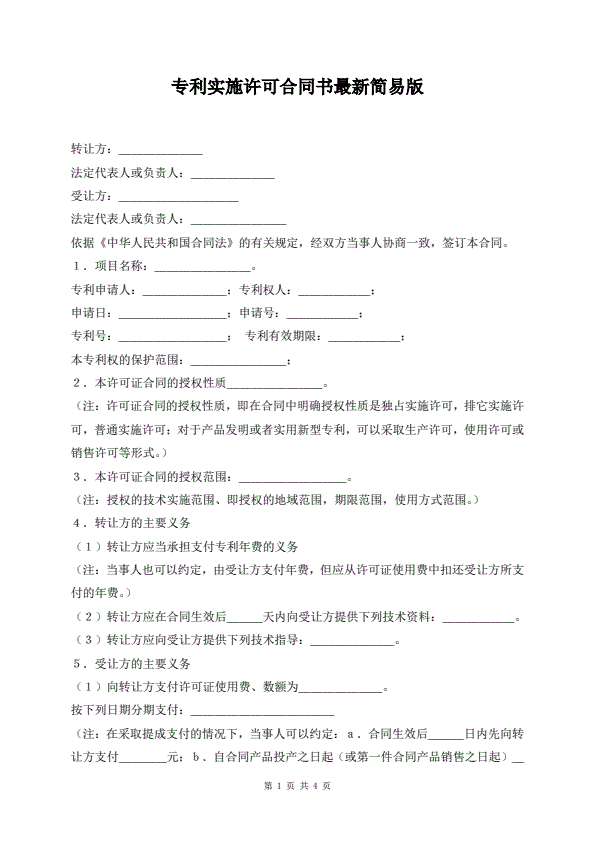 专利实施许可合同书最新简易版