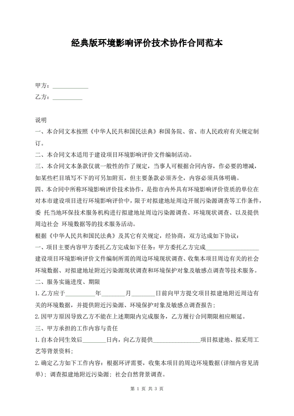 经典版环境影响评价技术协作合同范本