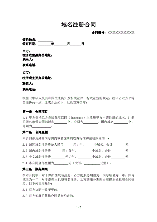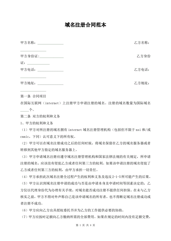 域名注册合同范本