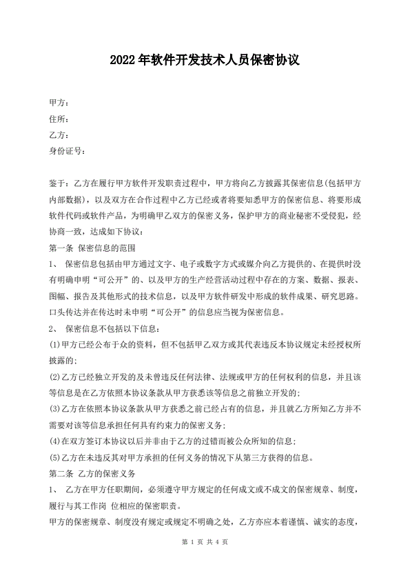 2022年软件开发技术人员保密协议