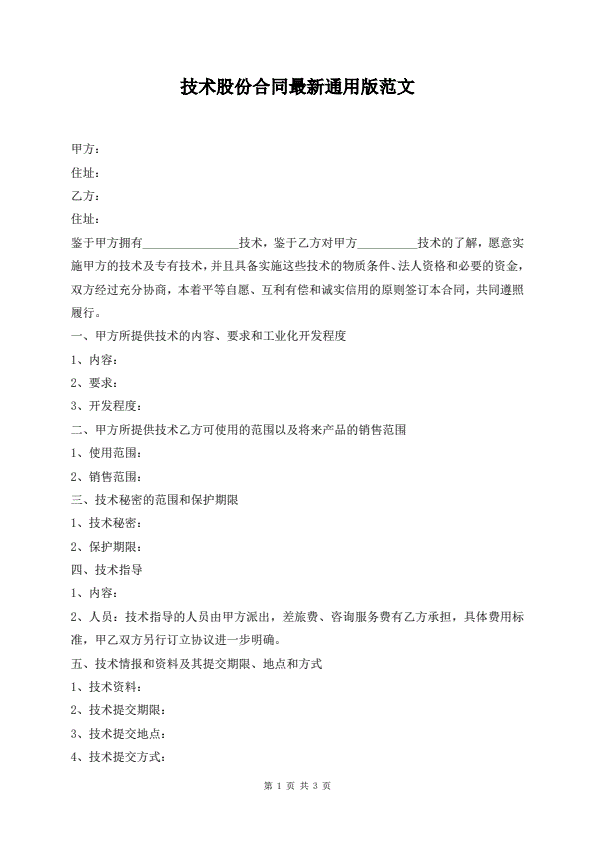 技术股份合同最新通用版范文