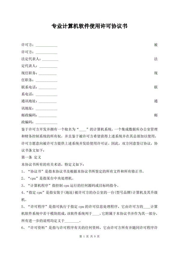 专业计算机软件使用许可协议书