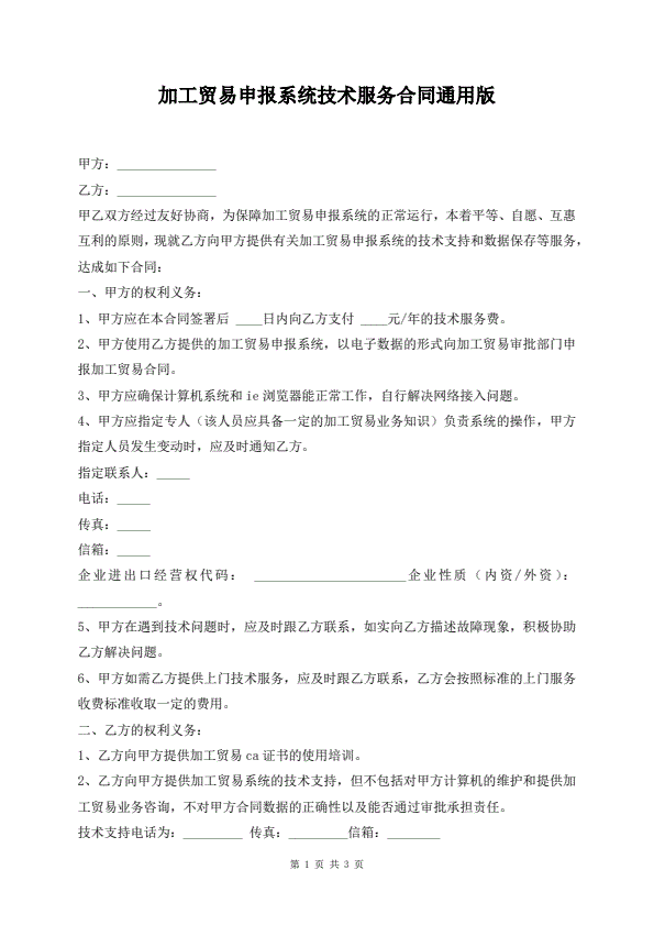 加工贸易申报系统技术服务合同通用版