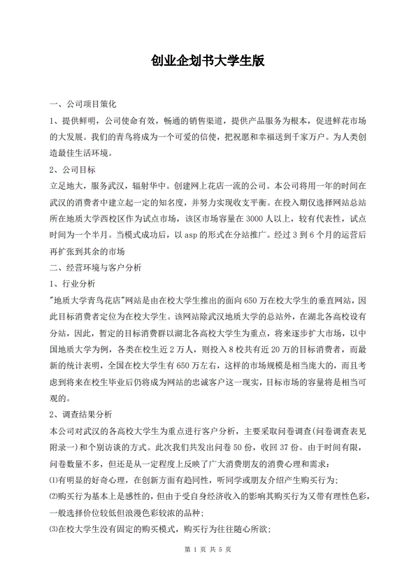 创业企划书大学生版