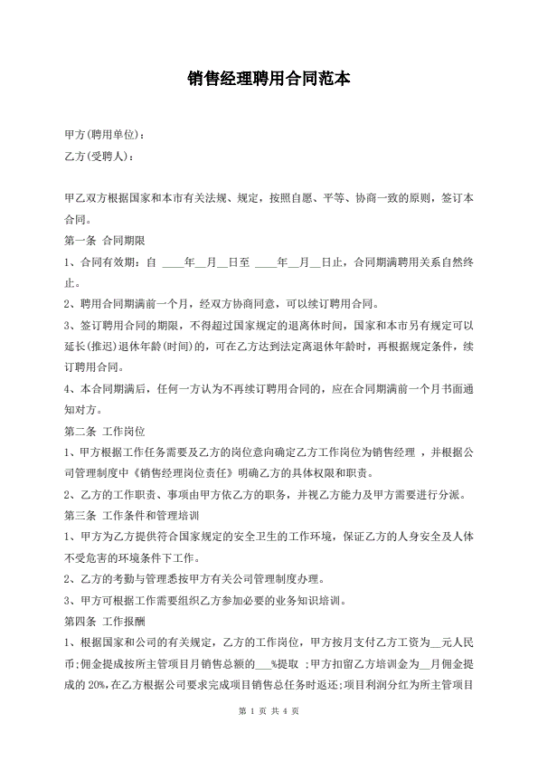 销售经理聘用合同范本