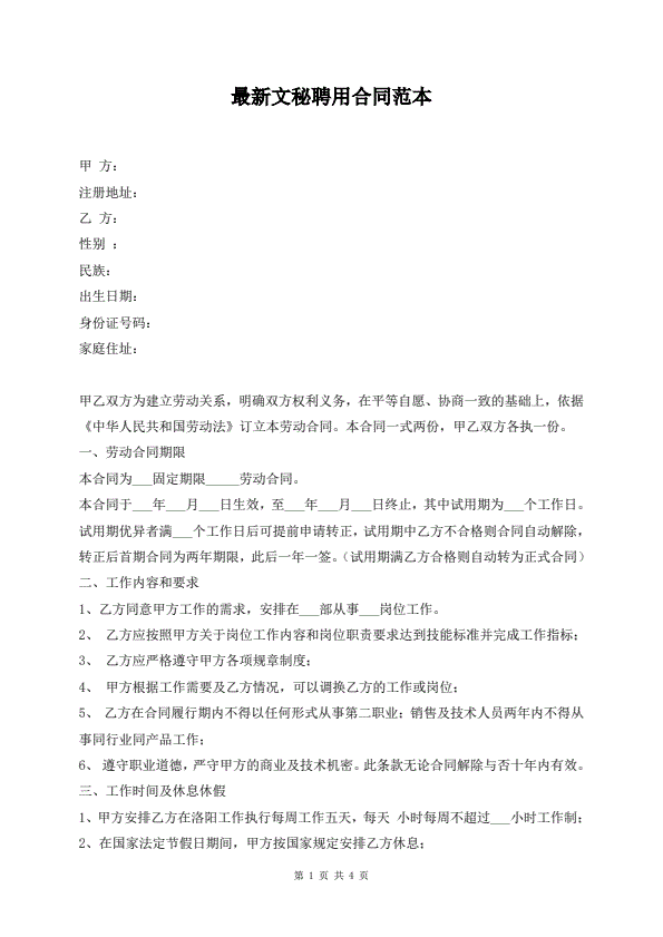 最新文秘聘用合同范本