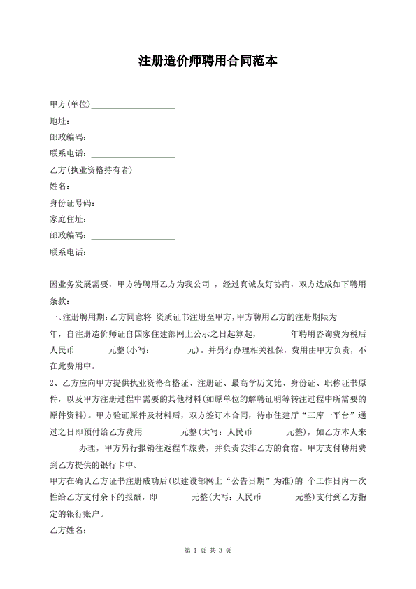 注册造价师聘用合同范本